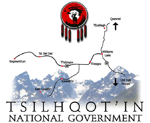 “The Tsilhqot’in National Government, established in 1989, is a tribal council that represents the Esdilagh ‘First Nation’ (Alexandria Band) {a ‘nation’ of 178 people}, Tsi Del Del ‘First Nation’ (Alexis Creek ‘First Nation’) {a ‘nation’ of 683 people}, Yunesit’in ‘First Nation’ (Stone Band) {a ‘nation’ of 424 people}, Tl’etinqox-t’in ‘First Nation’ (Anaham Band) {a ‘nation’ of 475 people}, Tl’esqox (Toosey ‘First Nation’) {a ‘nation’ of 3,700 people}, and the Xeni Gwet’in ‘First Nation’ (Nemiah Band) {a ‘nation’ of 185 people}, which are located throughout the Chilcotin Plateau. The 2011 ‘National Household Survey’ enumerated 1,195 speakers of the Tsilhqot’in Dene language.