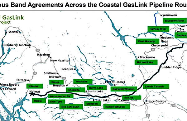 “The company says it had signed agreements with all 20 elected ‘First Nations’ {aboriginal tribes} along the 670-kilometre route to LNG Canada’s export terminal on the coast in Kitimat, including the Wet’suwet’en council…”