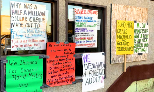 “Dozens of members and Elders set up a drum and tipi in front of their Band office…with a list of demands displayed, including the dismantling of quorum power; for ‘Ammunition and Twine’ funding to be issued to membership over the age of 18, and not Lacosse’s alleged business affiliates; removal of Lacosse’s employee affiliates; accountability for missing funds; and a general Band meeting. “Councillor Wanda Lewis told ‘meadowlakeNOW’ she and two other councillors have been excluded from council meetings regarding the financial health of the community. Excluded councillors were first alerted to alleged mismanaged funds when a cheque for $500,000 out of their $1.2 million in ‘Ammunition and Twine’ funding was issued to ‘Tripoint Financial Management’, a newly-formed company to which Lacosse is named as Chief Operating Officer.