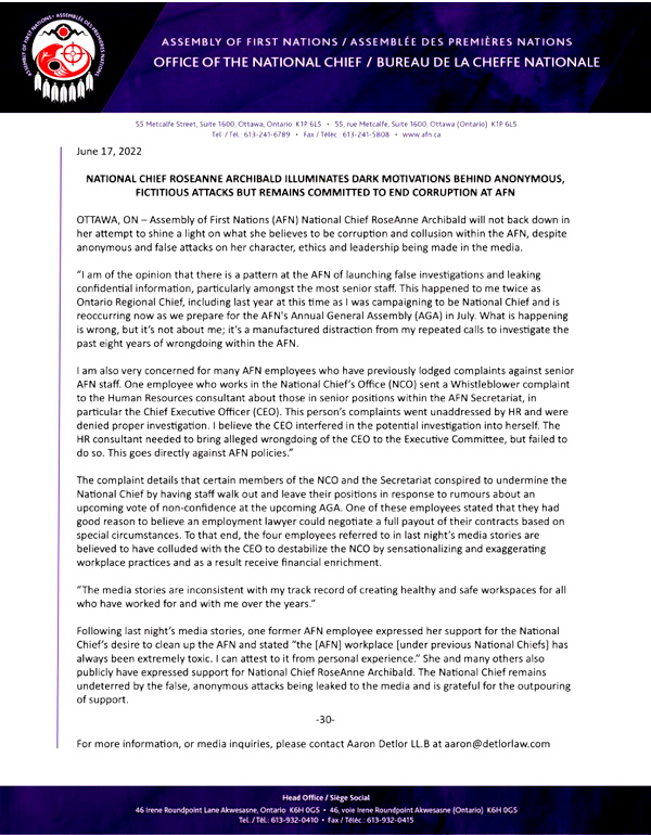 “As National Chief, I’ll continue to press for a forensic audit and full impartial investigation into theA‘FN’ and I’ll continue to release truthful information in the coming days. I remain undeterred in my conviction that the A‘FN’ is sorely in need of a forensic audit and independent investigation. Sunlight is the best disinfectant.”