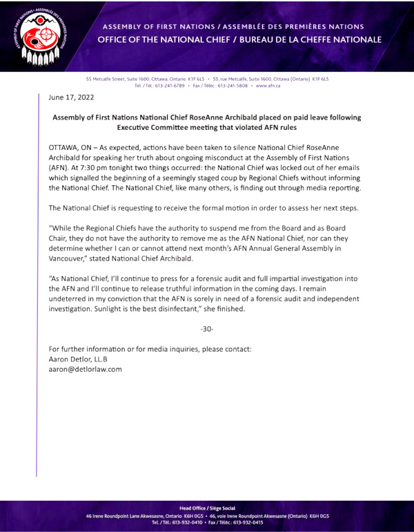 “The organization now says it suspended Archibald with pay pending the outcome of that investigation, which involves four complaints. She also cannot discuss the ongoing investigation publicly or attend the A‘FN’s annual general assembly and chief’s assembly meeting in early July, the organization says.