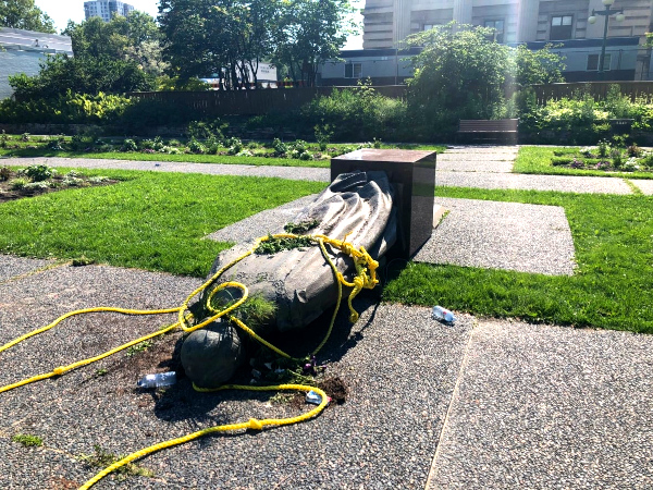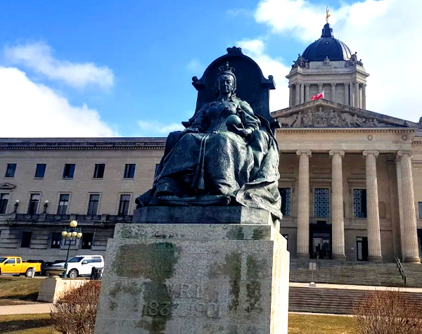 “The statue, a prominent monument on the front lawn of the legislature, was tied with ropes and hauled to the ground on Canada Day last year during a demonstration over the deaths of ‘Indigenous’ {sic} children at residential schools. It was covered with red paint. The head of the large statue was removed and found the next day in the nearby Assiniboine River.