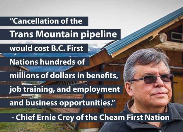 Cancellation of the ‘Trans Mountain’ pipeline would cost B.C. ‘First Nations’ hundreds of millions of dollars in benefits, job training, and employment and business opportunities, according to Cheam Chief Ernie Crey.”