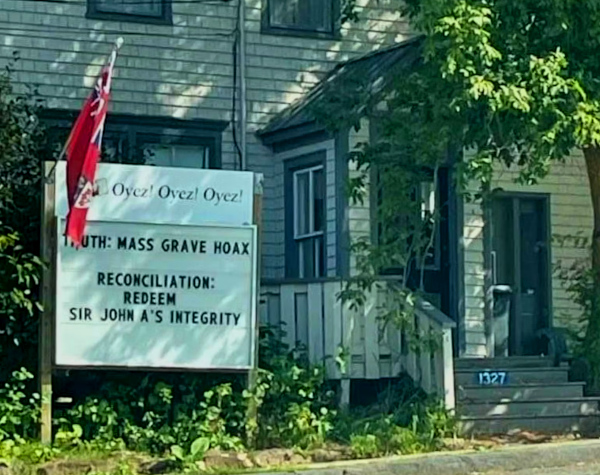 “Ahead of ‘National Day for Truth and Reconciliation’, a large sign on John Robertson’s property displayed the message, “Truth: mass grave hoax” and “Reconciliation: Redeem Sir John A.’s integrity”.