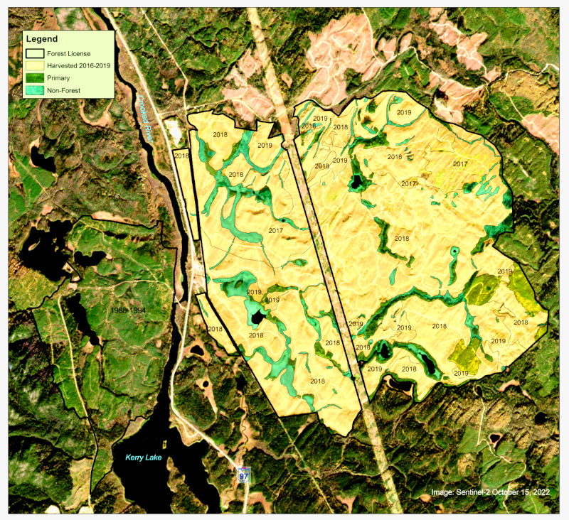 Map compiled from satellite data showing logging in the Kerry Lake East area. The years indicate when logging occurred. (Map via David Leversee)